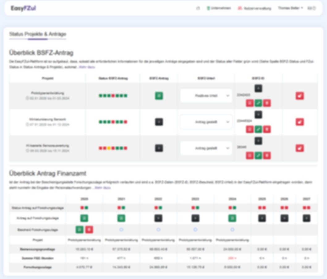Die Plattform EasyFZul ermöglicht die Bearbeitung von Anträgen auf Forschungszulage in einem Bruchteil der sonst erforderlichen Zeit. Dazu werden die verschiedenen Aufgaben auf die internen Know-how-Träger verteilt, die über einen eigenen Zugang die Informationen einfach und zielgerichtet bearbeiten können. Die für die Anträge erforderlichen Informationen werden anschließend automatisch im Antragsformat generiert. Diese müssen nur noch geprüft und per Copy & Paste in die entsprechenden Plattformen (BSFZ und ELSTER) übertragen werden. Zudem sind alle Daten prüfungskonform und konsistent an einem Ort gespeichert.