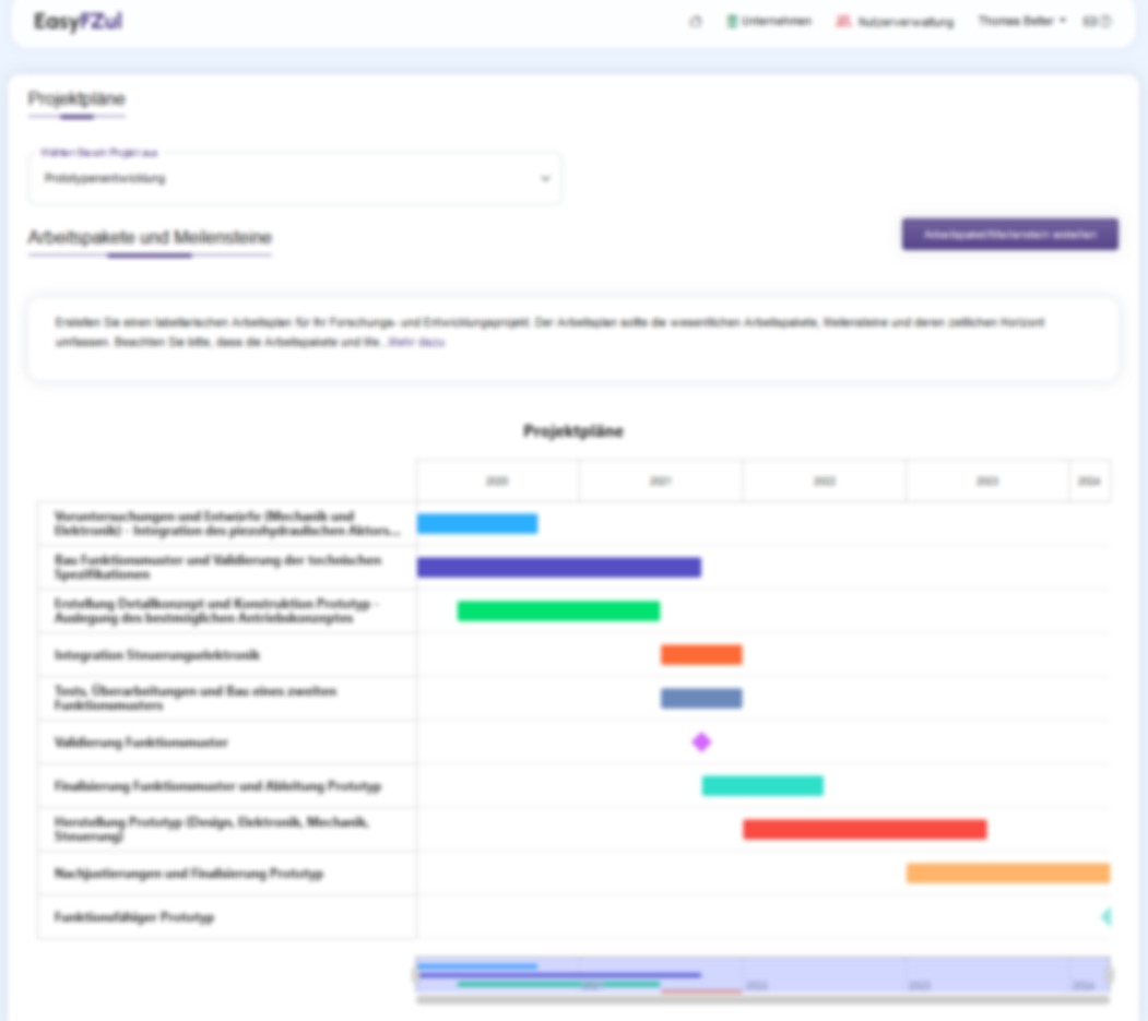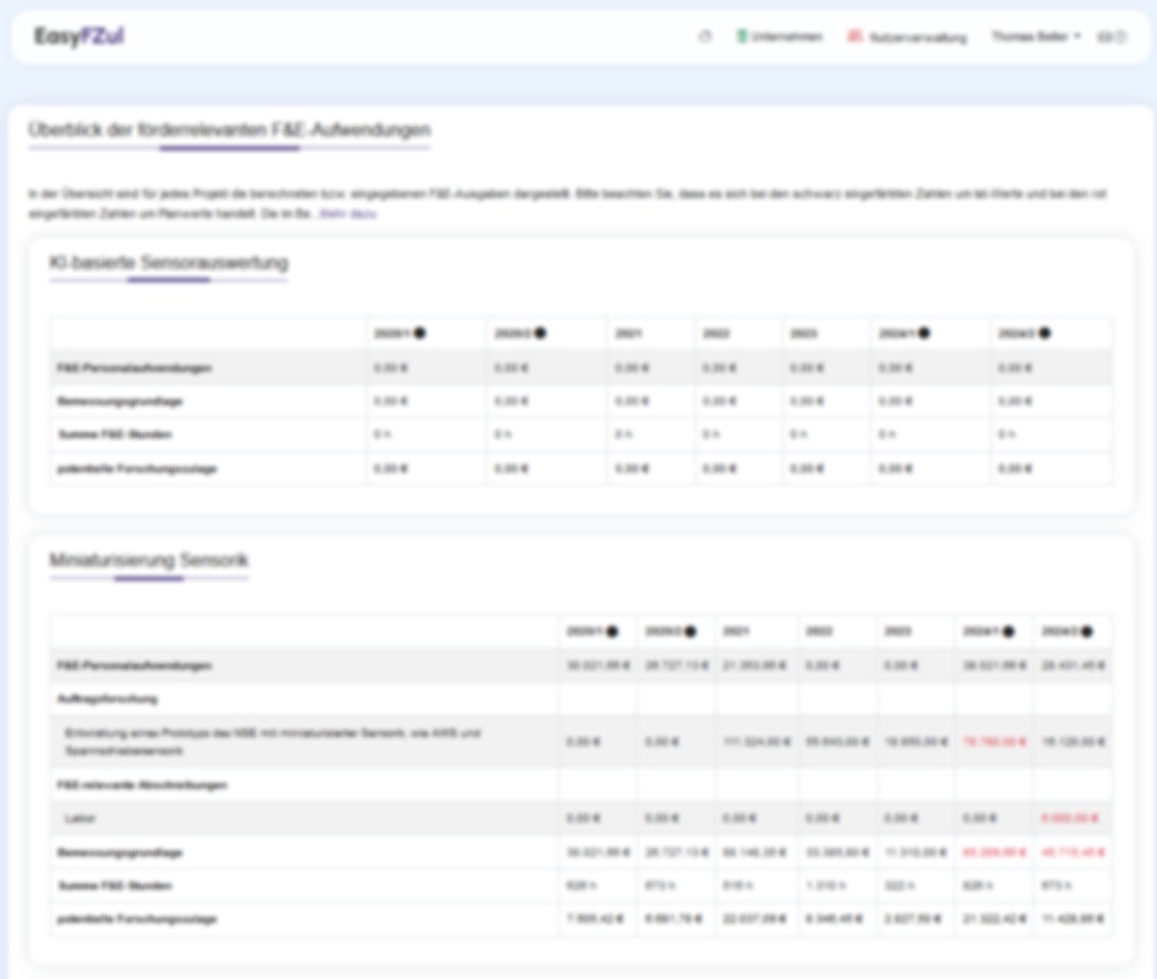 Die EasyFZul-Plattform ist ein professionelles, maßgeschneidertes Instrument zur schnellen, soliden und zielgerichteten Bearbeitung der Forschungszulage sowie prüfungssicheren Dokumentation Ihrer F&E-Projekte.
